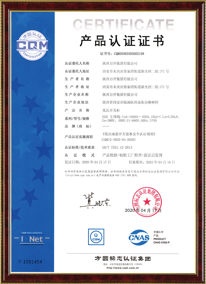 GCS產(chǎn)品認(rèn)證證書(1600A~4000A)